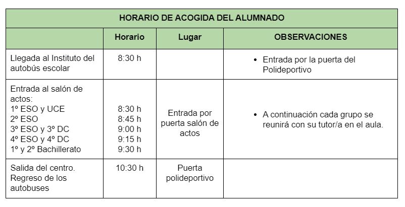 El viernes 5 de septiembre el horario de clases será el habitual, de 8:30 a 14:30 h.
